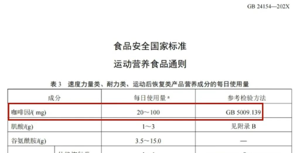 然而,我国《食品安全国家标准运动营养食品通则》(GB24154-2015)中对各类运动项目产品中营养成分的种类和每日使用量载明“咖啡因每日使用量20~100㎎”。若按该补剂用法服用一勺,咖啡因使用量远超国家食品安全标准。