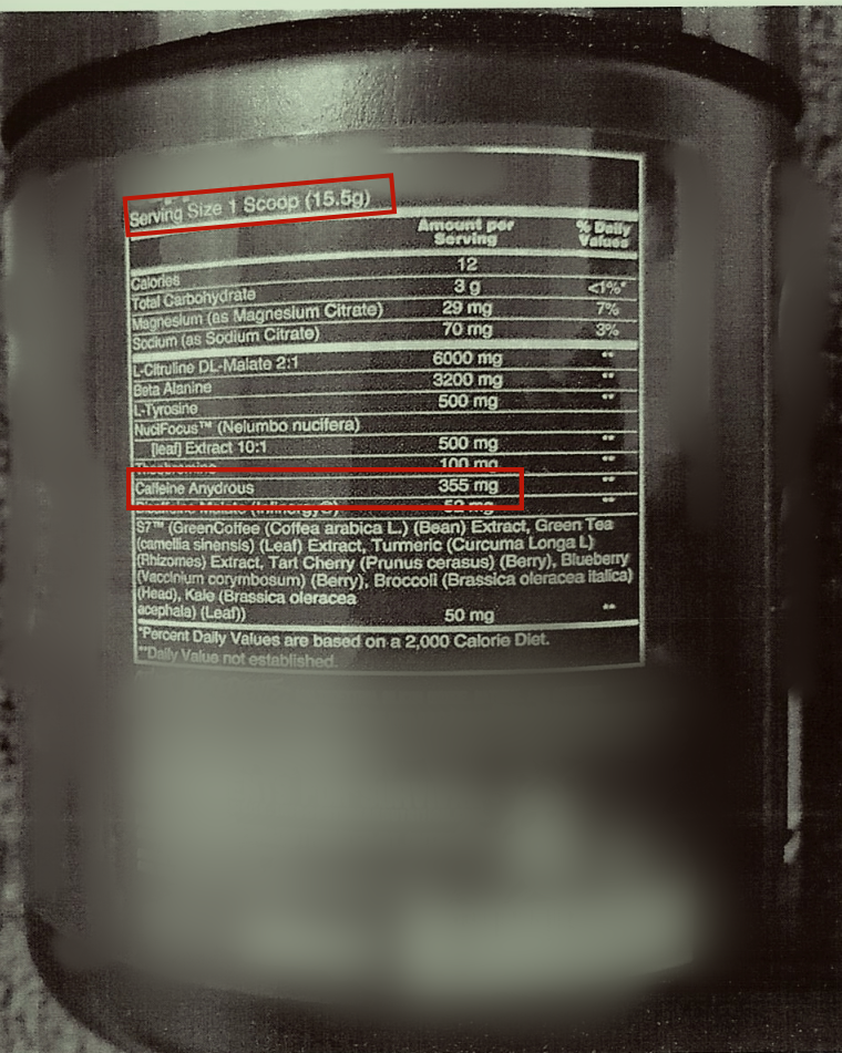 后在健身教练提醒下,小鹏发现该补剂的咖啡因含量严重超标。其购买的补剂瓶身上所附英文营养成分表显示:每勺(15.5克)补剂中咖啡因含量355毫克,用法为训练前一勺。