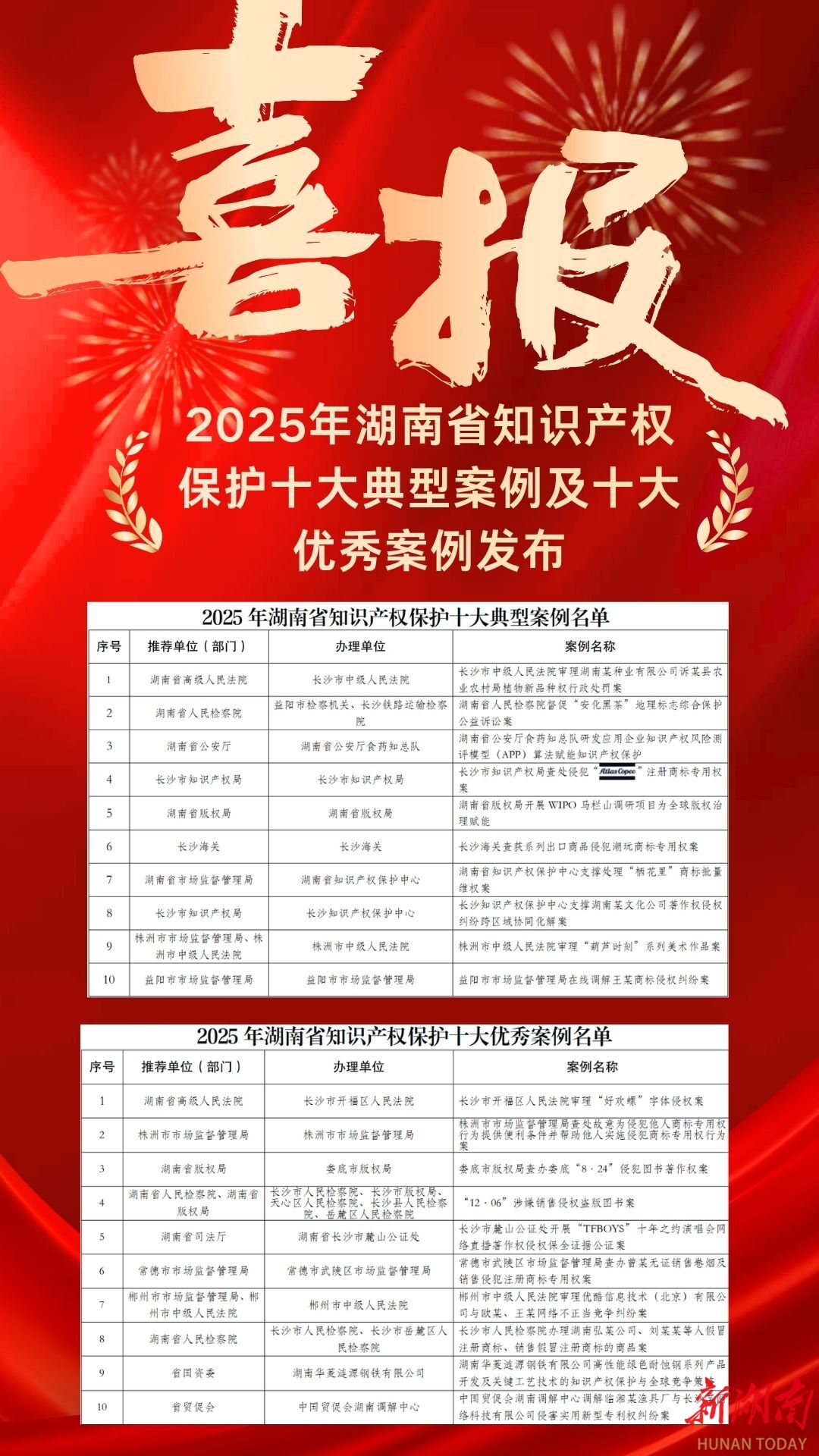 在第26个世界知识产权日到来之际,湖南省知识产权协调工作联席会议办公室发布2025年全省知识产权保护“十大典型案例”与“十大优秀案例”。