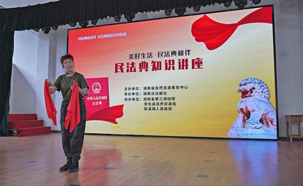 2024年5月31日,事务中心联合湖南法治报在安化县柘溪镇开展民法典下乡宣传 图为志愿者表演民法典宣传快板