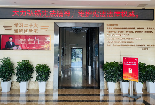 2023年12月,省机关事务管理局在办公楼大厅设置宪法宣传电子标语和展板。