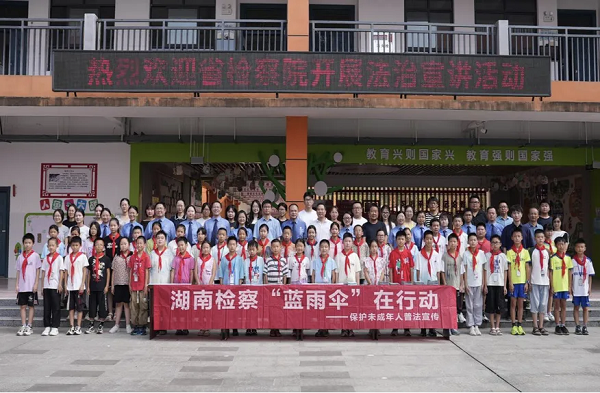 9月4日开学季,湖南省人民检察院在乡村振兴联系点石门县开展“蓝雨伞 护未来——检察机关乡村振兴法治行”主题活动,组织开学第一课。