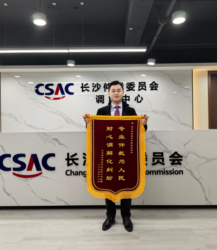 近日,长沙仲裁委员会调解中心的办公区里暖意融融,两面红彤彤的锦旗被当事人郑重地送到仲裁秘书陈家骏手中。双手接过锦旗,陈家骏脸上露着欣慰的笑容,内心充满被当事人认可的喜悦,也深感仲裁调解工作的使命与责任。