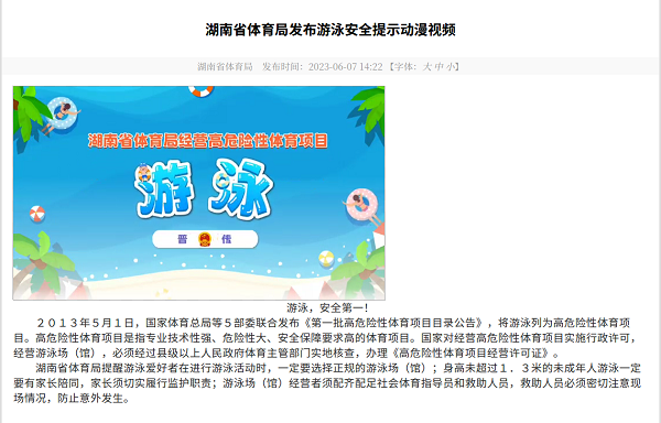 在新湖南、红网、湖南体育发布《经营高危险性体育项目(游泳)》普法动漫视频,浏览量超18万次。